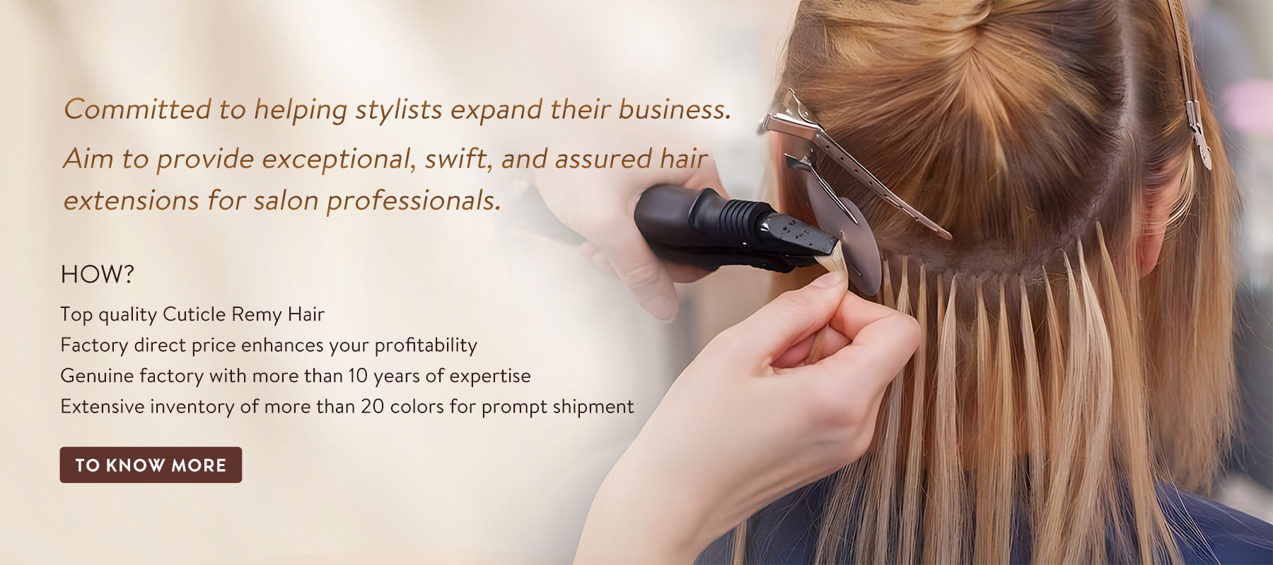 With a decade of experience in crafting human hair products, our expertise lies in the delicate and mild treatment of hair to protect its quality to the fullest extent. Our skilled artisans employ mature craftsmanship to manufacture a diverse range of extension methods. We are open and honest with our clients about the processes, and take responsibility for any products exhibiting actual production faults.